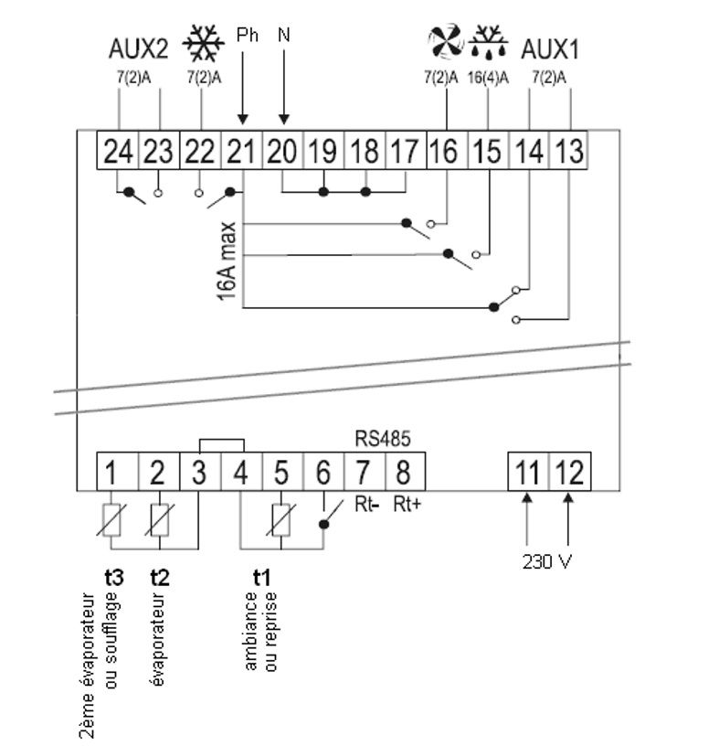 1 relais 250V 16(4) A pour dégivrage, 4 relais 250V 7(2) A pour compresseur, ventilateur et auxiliaires