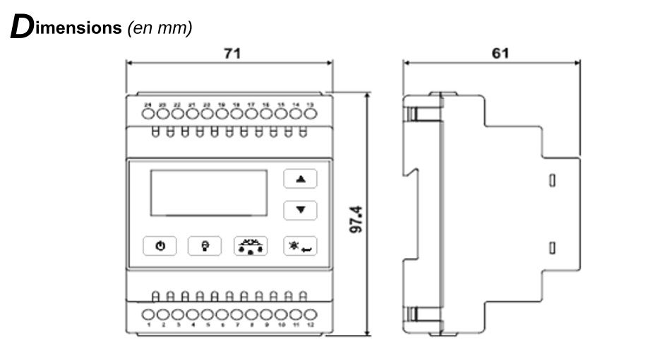 Sorties relais | 1 relais 250V 16(4) A pour dégivrage, 4 relais 250V 7(2) A pour compresseur, ventilateur et auxiliaires |